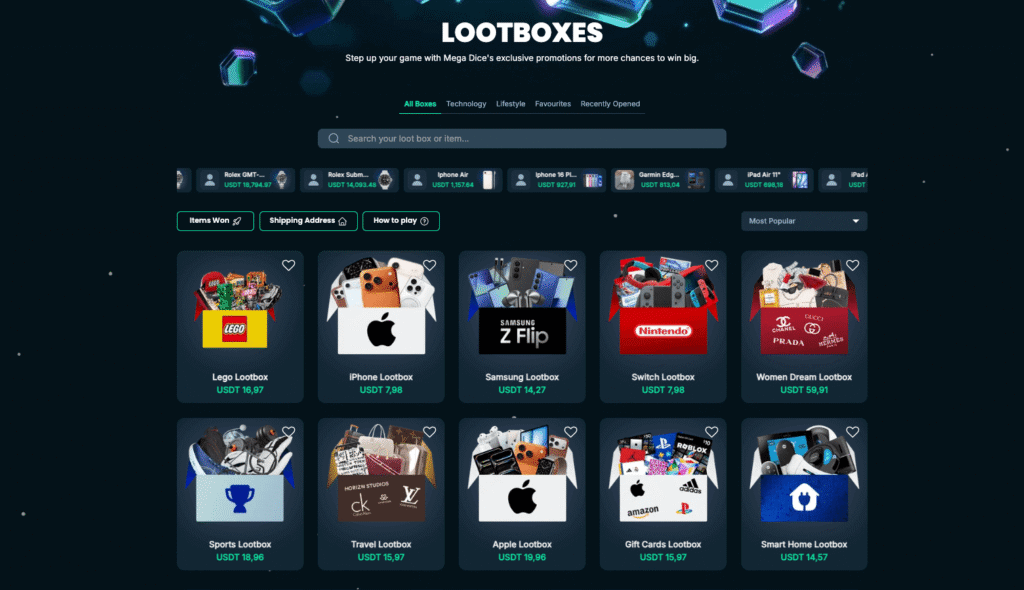 Mega Dice takes a different approach. Instead of tying lootboxes to deposits, they’ve created a full marketplace where you buy boxes directly with your casino balance. This gives you complete control over when and how often you engage with lootboxes. The platform handles the logistics of shipping physical items won, which is unusual in crypto gambling but adds serious legitimacy.