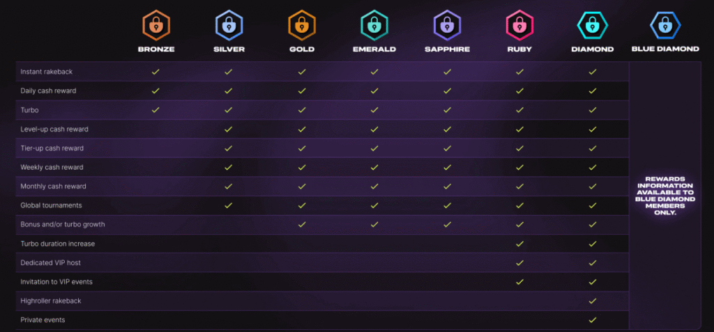 You earn rakeback on every bet, with percentages increasing as you climb tiers. TURBO is a temporary rakeback boost that activates when you claim rewards, significantly increasing your return on casino play.