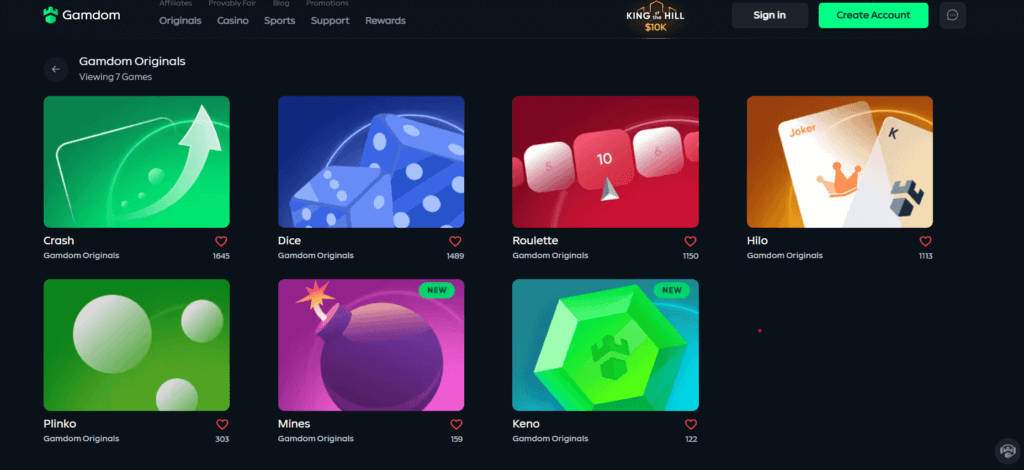 For exclusive games only available to Gamdom players, this is the category you’d want to check out. Exciting titles you can play include Crash, Dice, Hilo, Plinko, Mines, and Keno. Play fast-paced games with instant wins that will give you an adrenaline rush.