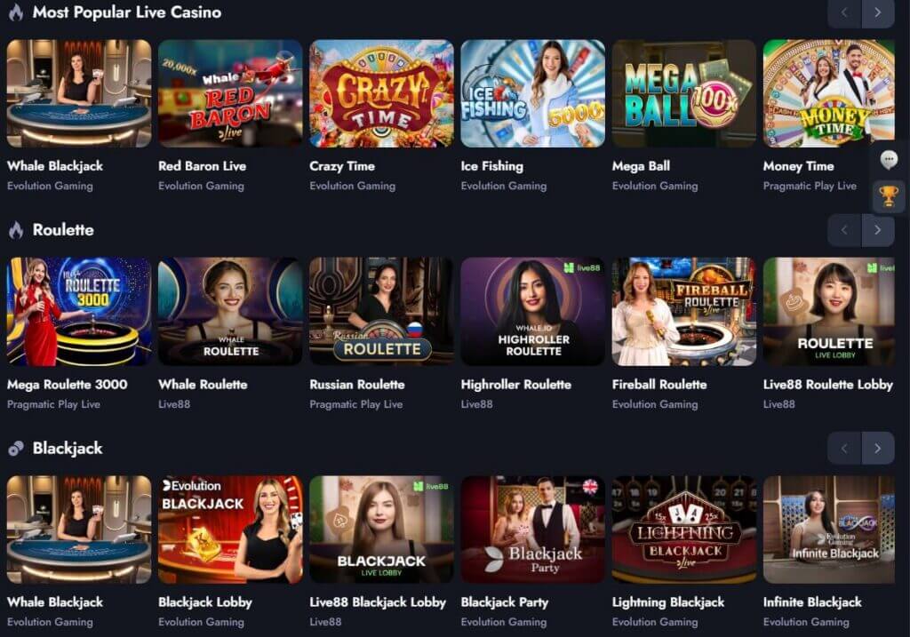 Again, Whale.io Casino does a superb job of organizing its live dealer games. With every title, you can see its category, whether it’s blackjack, poker, or baccarat, and the provider of the game. You can also find thrilling game shows like Sweet Bonanza, Mega Wheel, and Money Time.
