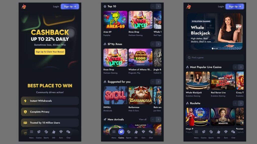 A Next-Gen Crypto Casino🚀Whale.io Casino’s design seems to reflect exactly what crypto gamblers want. An immersive gaming experience that’s anonymous and features the perks that come with web3 crypto gaming. Find out more about Whale.io in our review.
