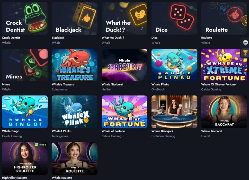 For provably fair games that really offer that unique Whale.io gaming experience, this is the category for you. The selection has 17 titles, including Whale Starburst, Dice, Mine, Plinko, and Bingo.